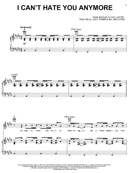 So, go ahead and download I Can't Hate You Anymore sheet music and start playing this wonderful score in bare minutes.