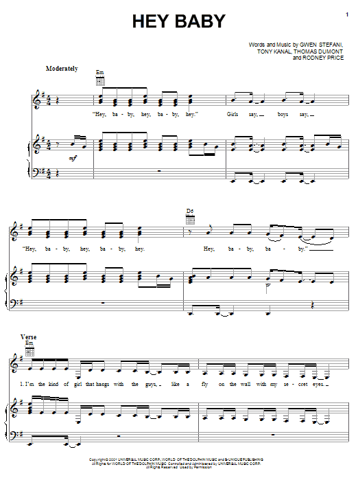 No Doubt Hey Baby sheet music, chords, lyrics - Printable PDF for Piano, Vocal & Guitar (Right-Hand Melody)