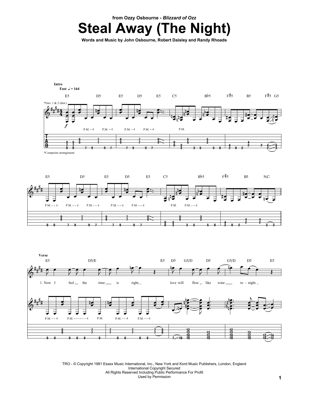 Download Ozzy Osbourne Steal Away (The Night) sheet music and printable PDF notes for Guitar Tab. This score composition includes 11 page(s). It was wonderfuly put together for the style of Pop with catalog SKU number of 162055. Popular song was originally published on 2015-10-24T00:00:00 and was updated on 2022-12-01T00:00:00. The arrangement code for Ozzy Osbourne sheet music is TAB and minimum required purchase quantaty of the digital score is 1. Learn more about Ozzy Osbourne and click here ».