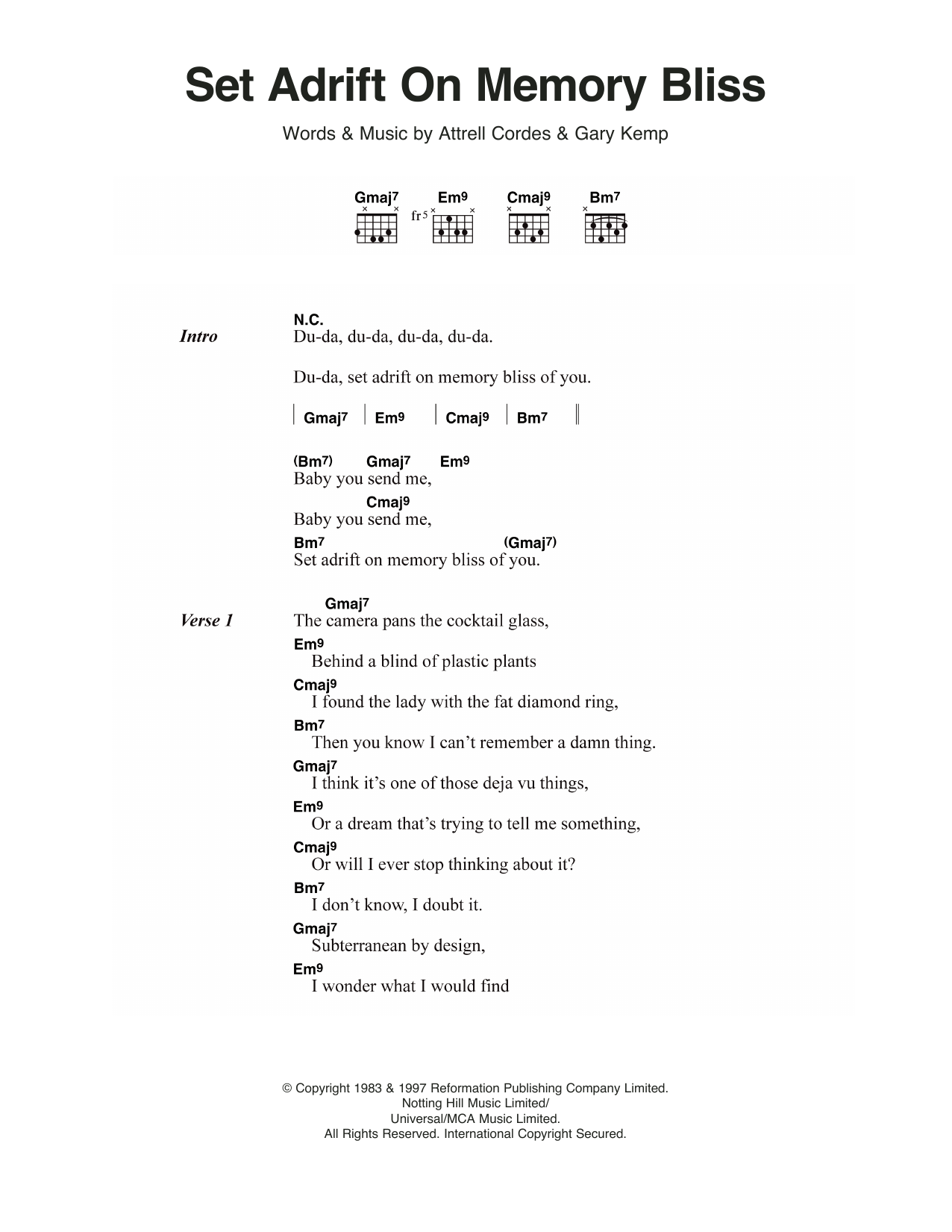Download P.M. Dawn Set Adrift On Memory Bliss sheet music and printable PDF notes for Guitar Chords/Lyrics. This score composition includes 4 page(s). It was wonderfuly put together for the style of Pop with catalog SKU number of 116763. Popular song was originally published on 2013-08-21T00:00:00 and was updated on 2021-03-08T00:00:00. The arrangement code for P.M. Dawn sheet music is LC and minimum required purchase quantaty of the digital score is 1. Learn more about P.M. Dawn and click here ».