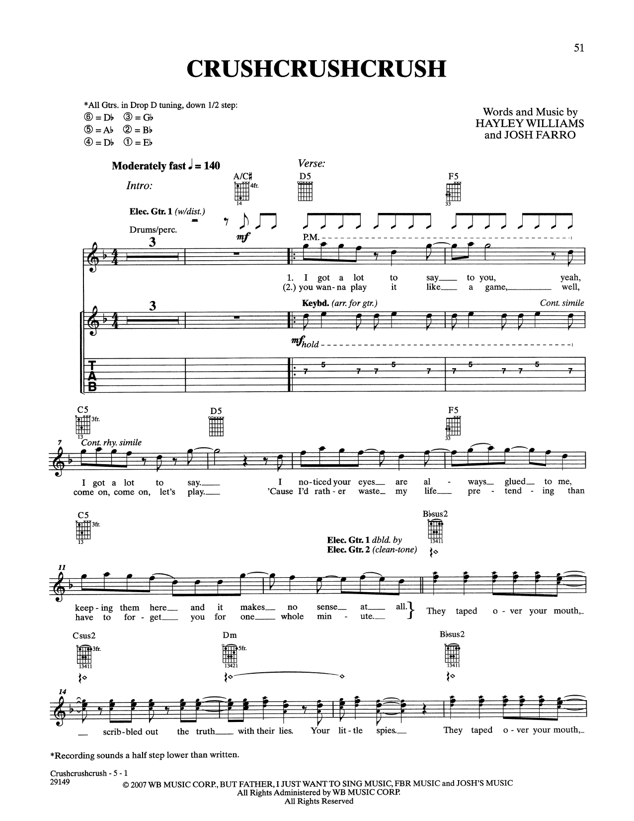 Paramore CrushCrushCrush sheet music, chords, lyrics - Printable PDF for Guitar Tab