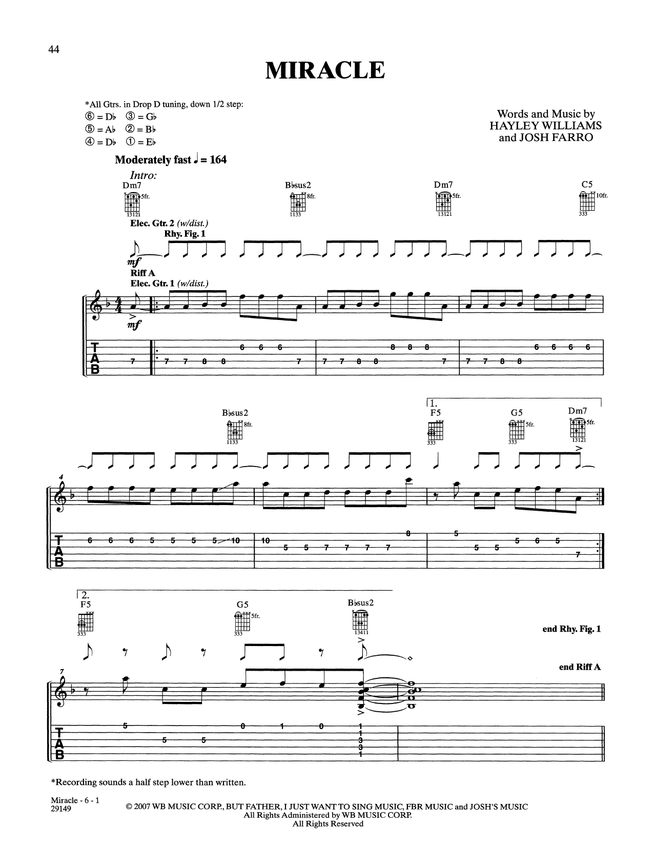 Paramore Miracle sheet music, chords, lyrics - Printable PDF for Guitar Tab
