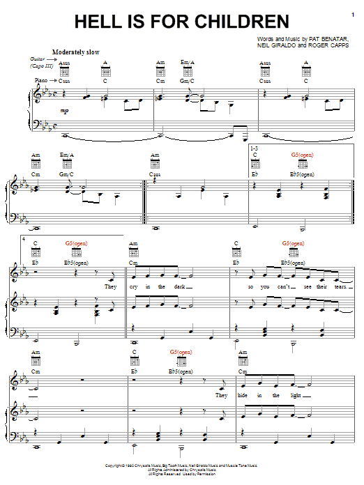 Pat Benatar Hell Is For Children sheet music, chords, lyrics - Printable PDF for Piano, Vocal & Guitar (Right-Hand Melody)