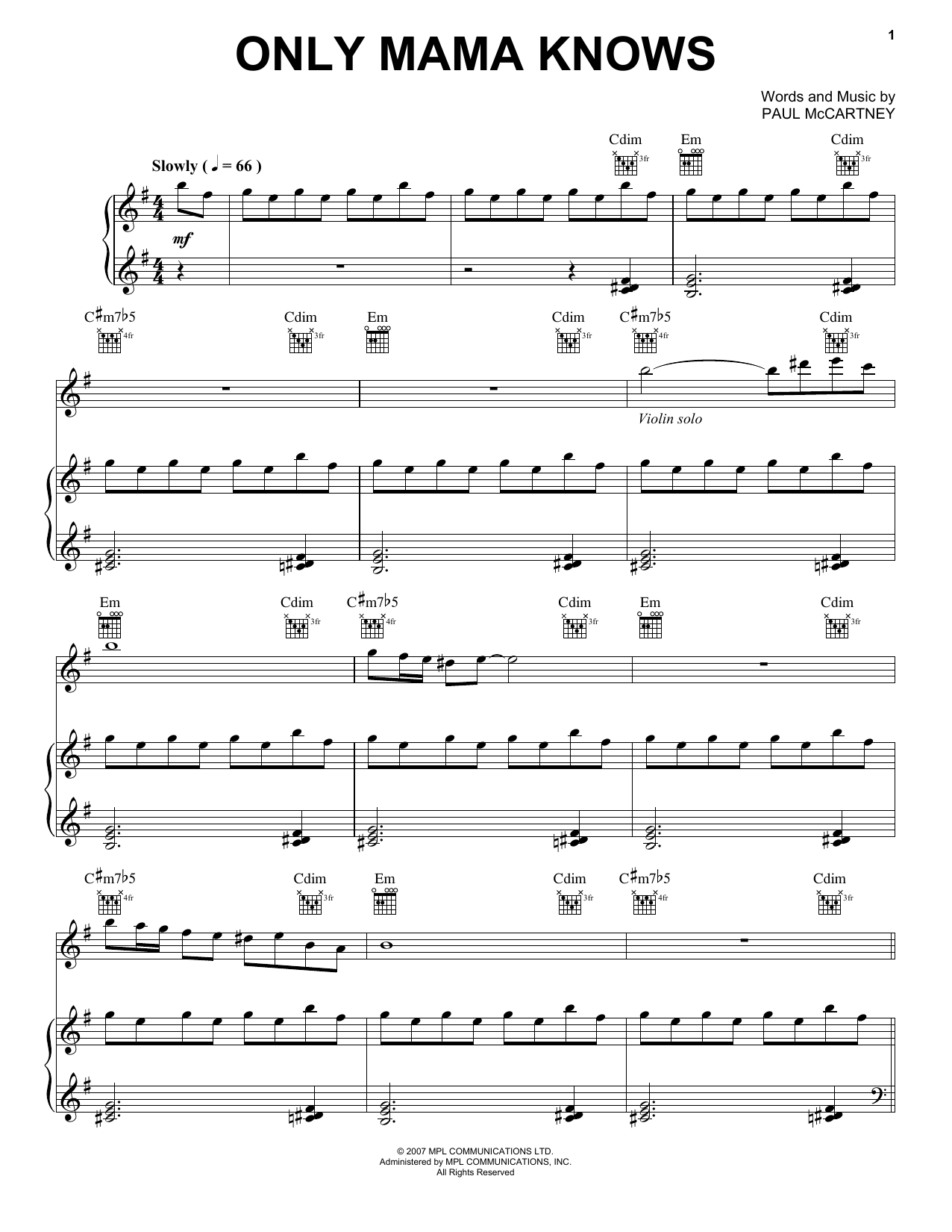 Paul McCartney Only Mama Knows sheet music, chords, lyrics - Printable PDF for Easy Piano