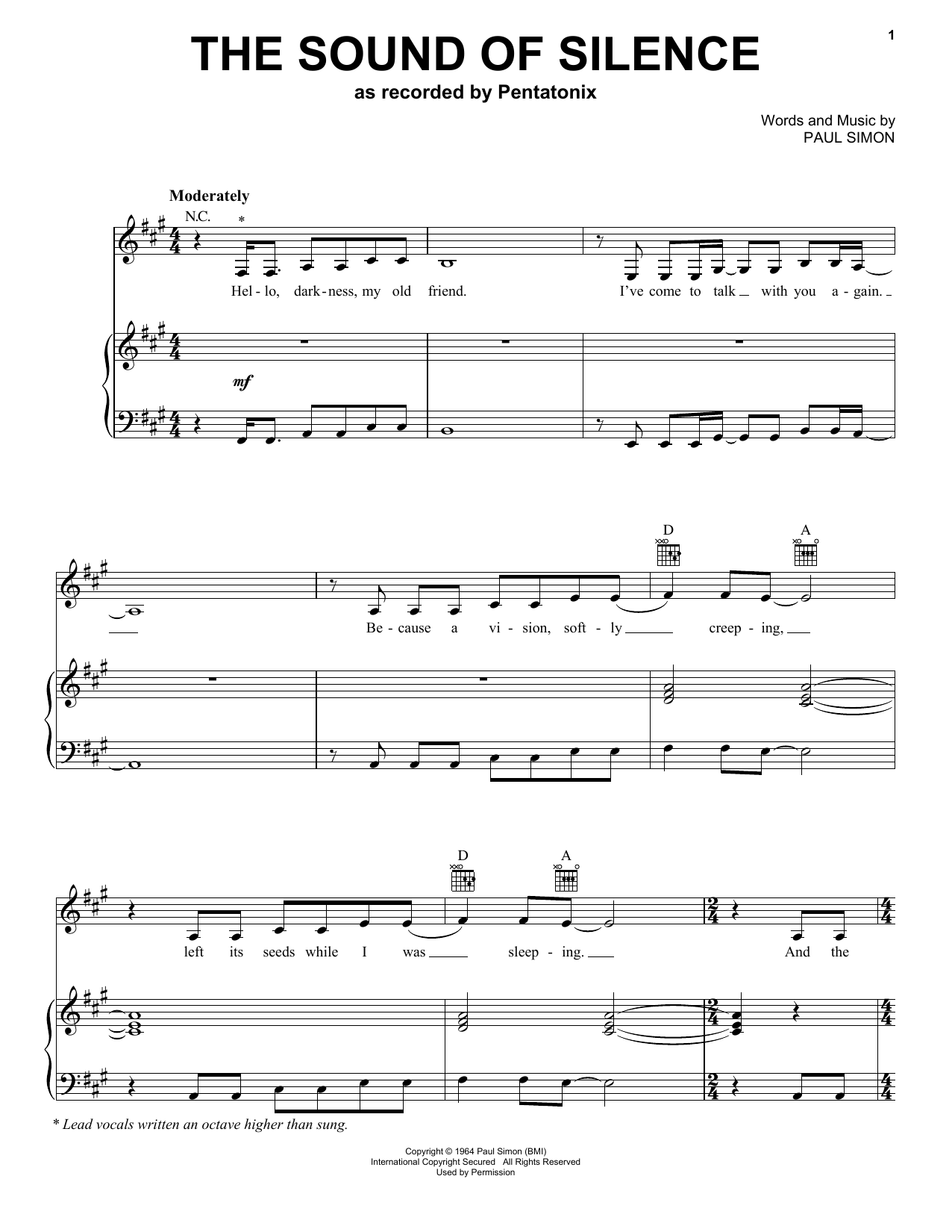 Pentatonix The Sound Of Silence sheet music, chords, lyrics - Printable PDF for Piano, Vocal & Guitar (Right-Hand Melody)