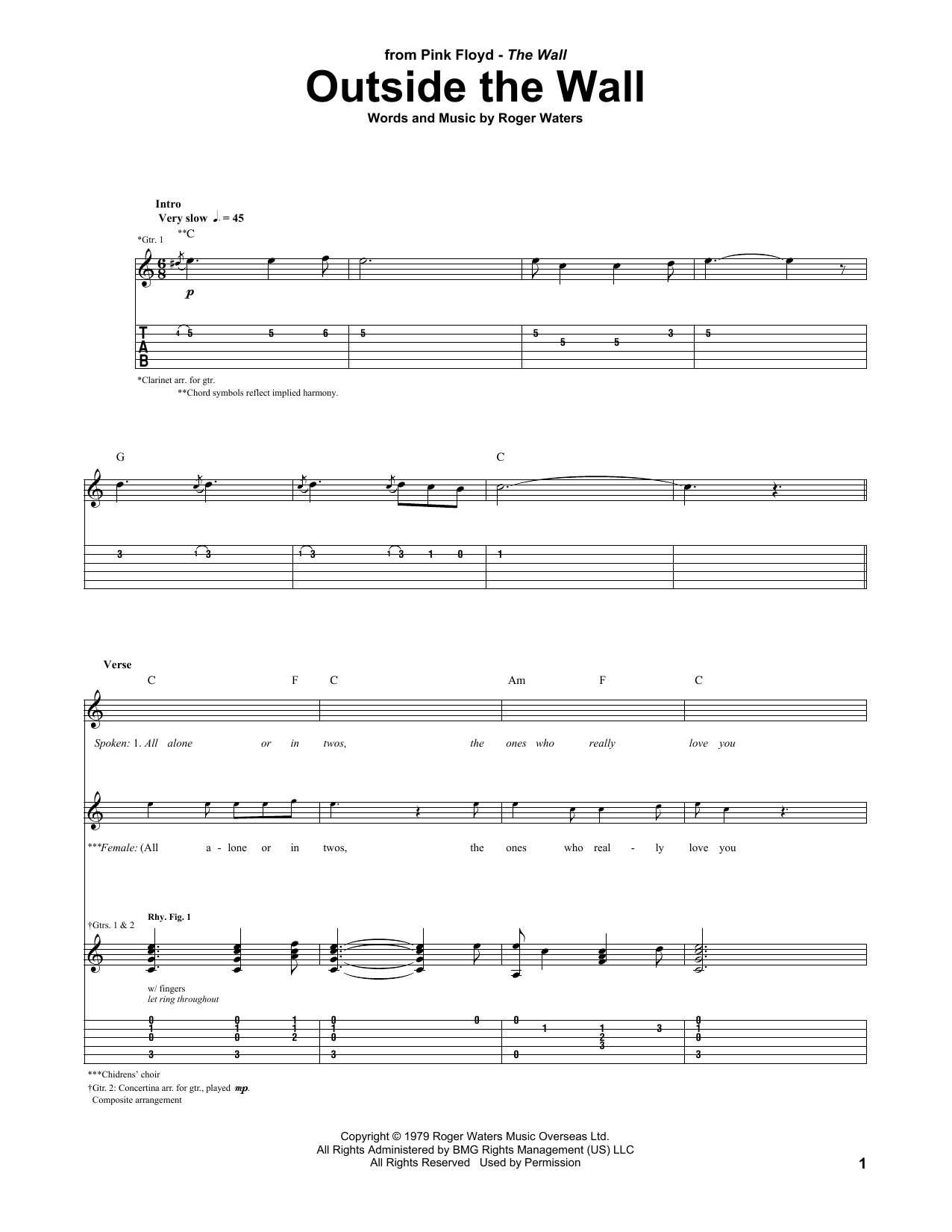 Pink Floyd Outside The Wall sheet music, chords, lyrics - Printable PDF for Guitar Tab