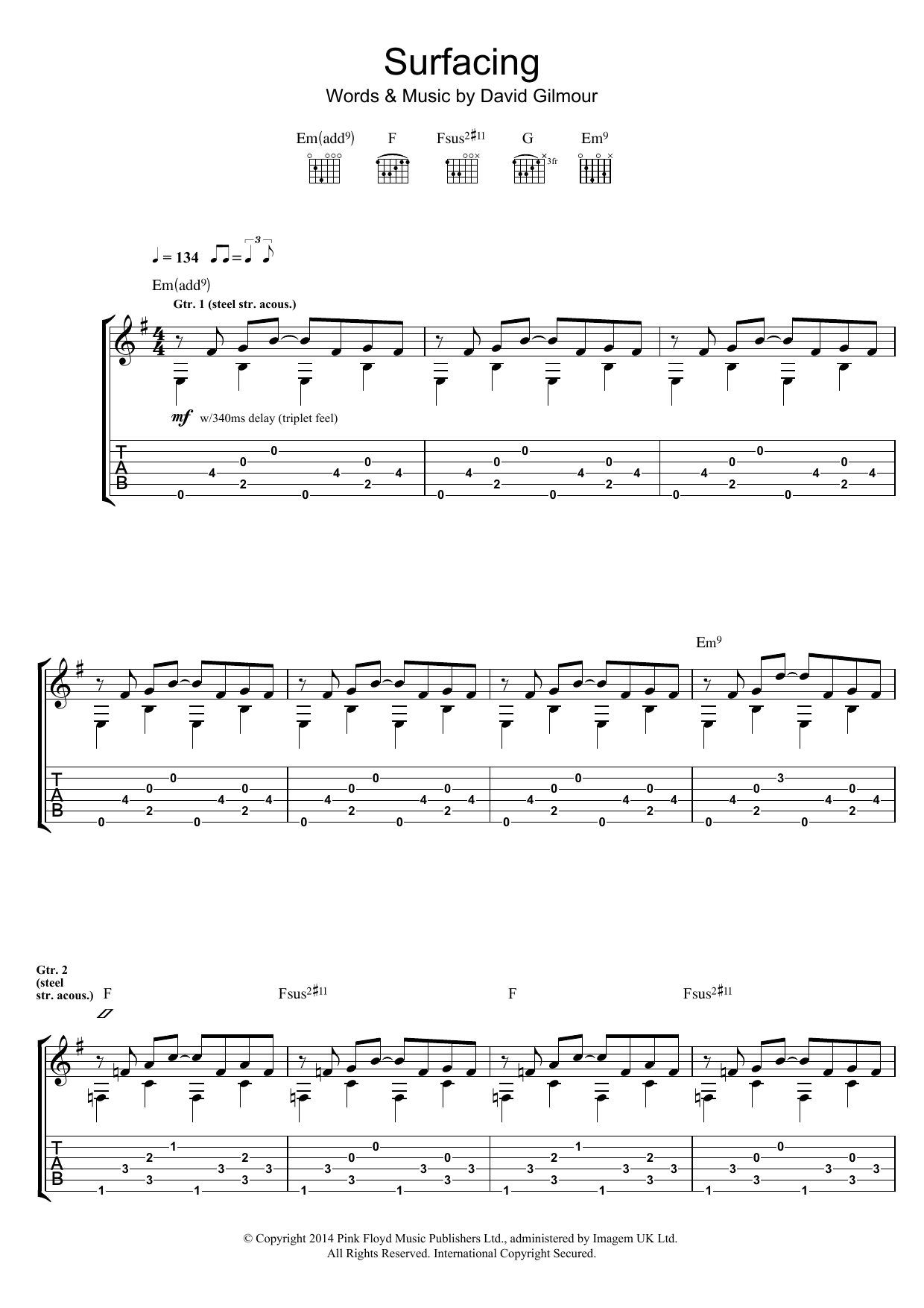 Pink Floyd Surfacing sheet music, chords, lyrics - Printable PDF for Guitar Tab