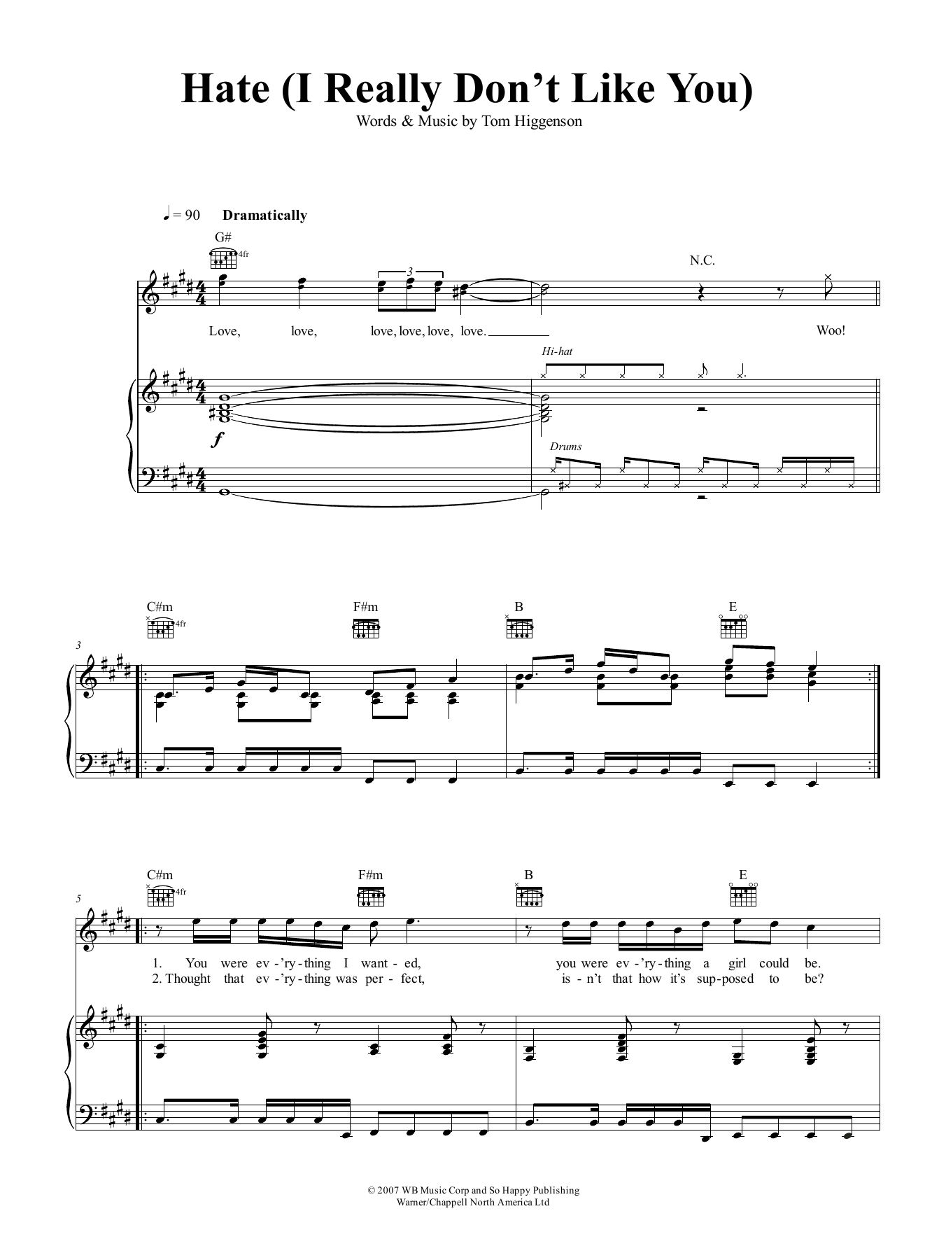 Plain White T's Hate (I Really Don't Like You) sheet music, chords, lyrics - Printable PDF for Piano, Vocal & Guitar (Right-Hand Melody)