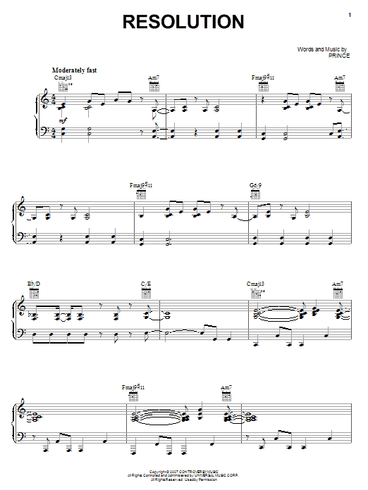 Prince Resolution sheet music, chords, lyrics - Printable PDF for Piano, Vocal & Guitar (Right-Hand Melody)
