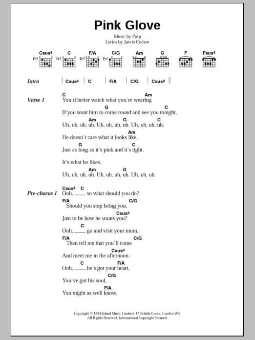Pulp Pink Glove sheet music, chords, lyrics - Printable PDF for Lyrics & Chords
