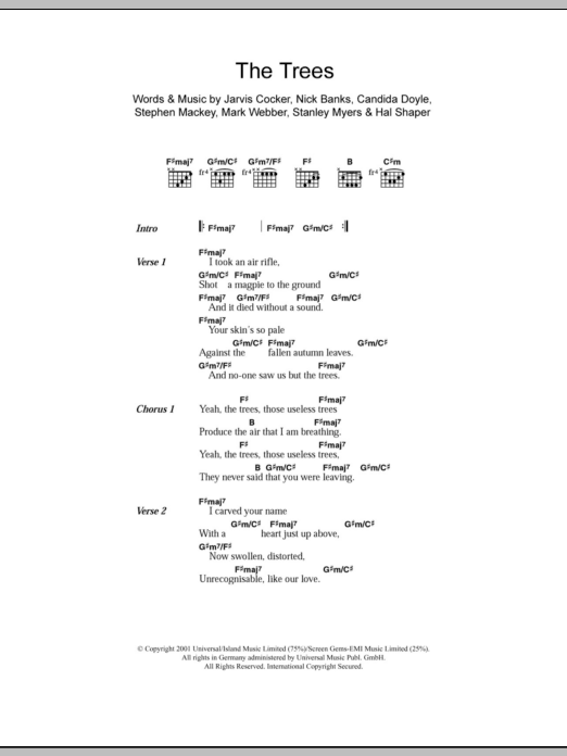 Pulp The Trees sheet music, chords, lyrics - Printable PDF for Lyrics & Chords