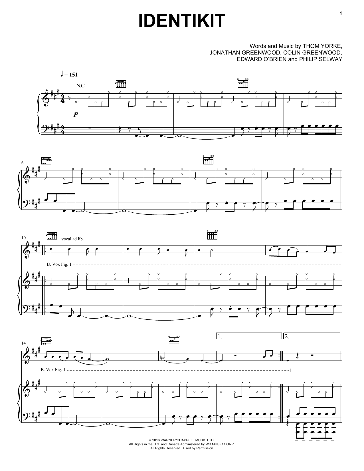 Radiohead Identikit sheet music, chords, lyrics - Printable PDF for Piano, Vocal & Guitar (Right-Hand Melody)