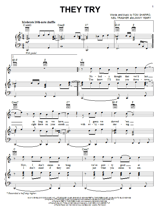 Download Rascal Flatts They Try sheet music and printable PDF notes for Piano, Vocal & Guitar Chords (Right-Hand Melody). This score composition includes 5 page(s). It was wonderfuly put together for the style of Pop with catalog SKU number of 85320. Popular song was originally published on 2011-08-26T00:00:00 and was updated on 2021-11-10T00:00:00. The arrangement code for Rascal Flatts sheet music is PVGRHM and minimum required purchase quantaty of the digital score is 1. Learn more about Rascal Flatts and click here ».