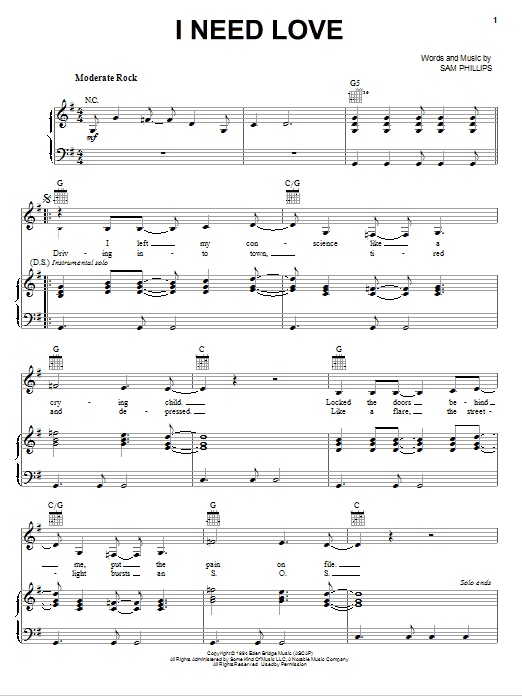 Sam Phillips I Need Love sheet music, chords, lyrics - Printable PDF for Piano, Vocal & Guitar (Right-Hand Melody)