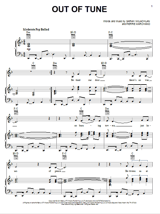 Sarah McLachlan Out Of Tune sheet music, chords, lyrics - Printable PDF for Piano, Vocal & Guitar (Right-Hand Melody)