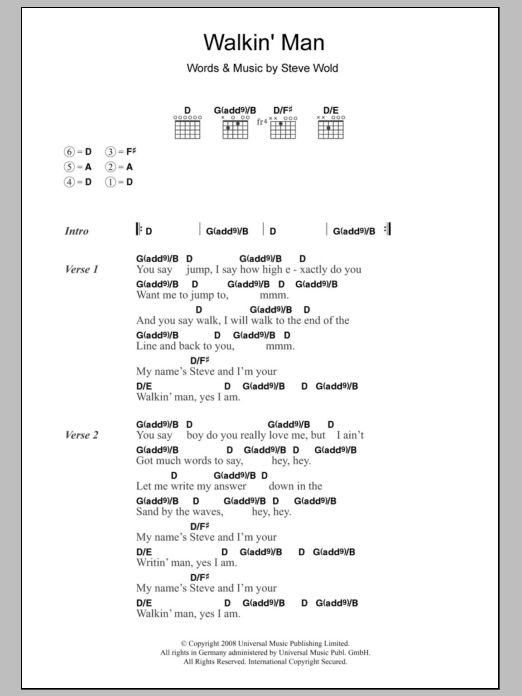 * Click playback or notes icon (wheel cog) at the bottom of the interactive music notes viewer and check "Walkin' Man" playback & transpose functionality prior to purchase.