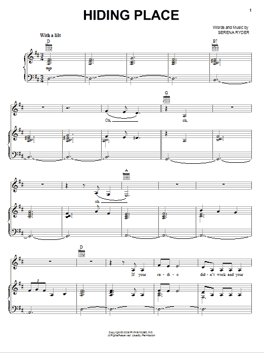 Serena Ryder Hiding Place sheet music, chords, lyrics - Printable PDF for Piano, Vocal & Guitar (Right-Hand Melody)