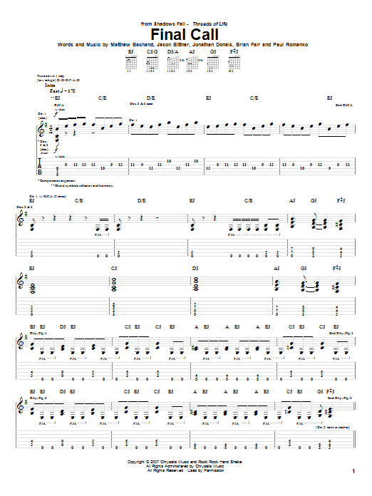 Shadows Fall Final Call sheet music, chords, lyrics - Printable PDF for Guitar Tab