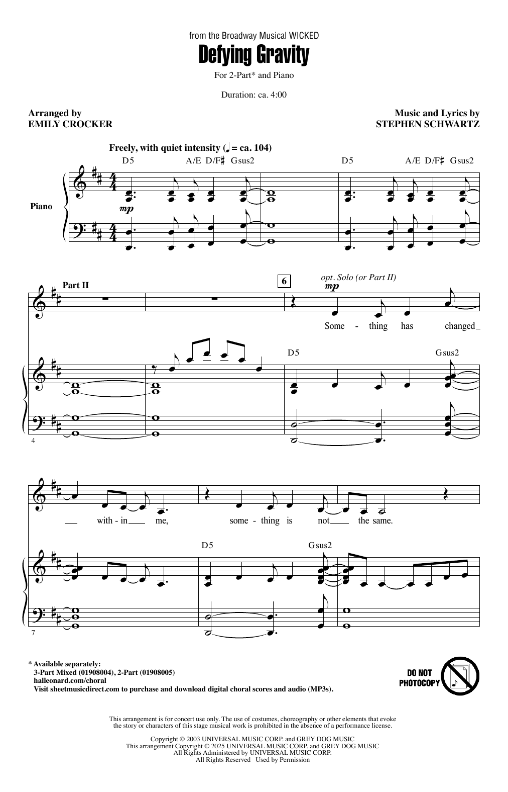 Download Stephen Schwartz Defying Gravity (from Wicked) (arr. Emily Crocker) sheet music and printable PDF notes for 2-Part Choir. This score composition includes 15 page(s). It was wonderfuly put together for the style of Musical/Show with catalog SKU number of 1813005. Popular song was originally published on 2025-08-22T00:00:00 and was updated on 2025-08-22T00:00:00. The arrangement code for Stephen Schwartz sheet music is 2PTCHOIR and minimum required purchase quantaty of the digital score is 10. Learn more about Stephen Schwartz and click here ».