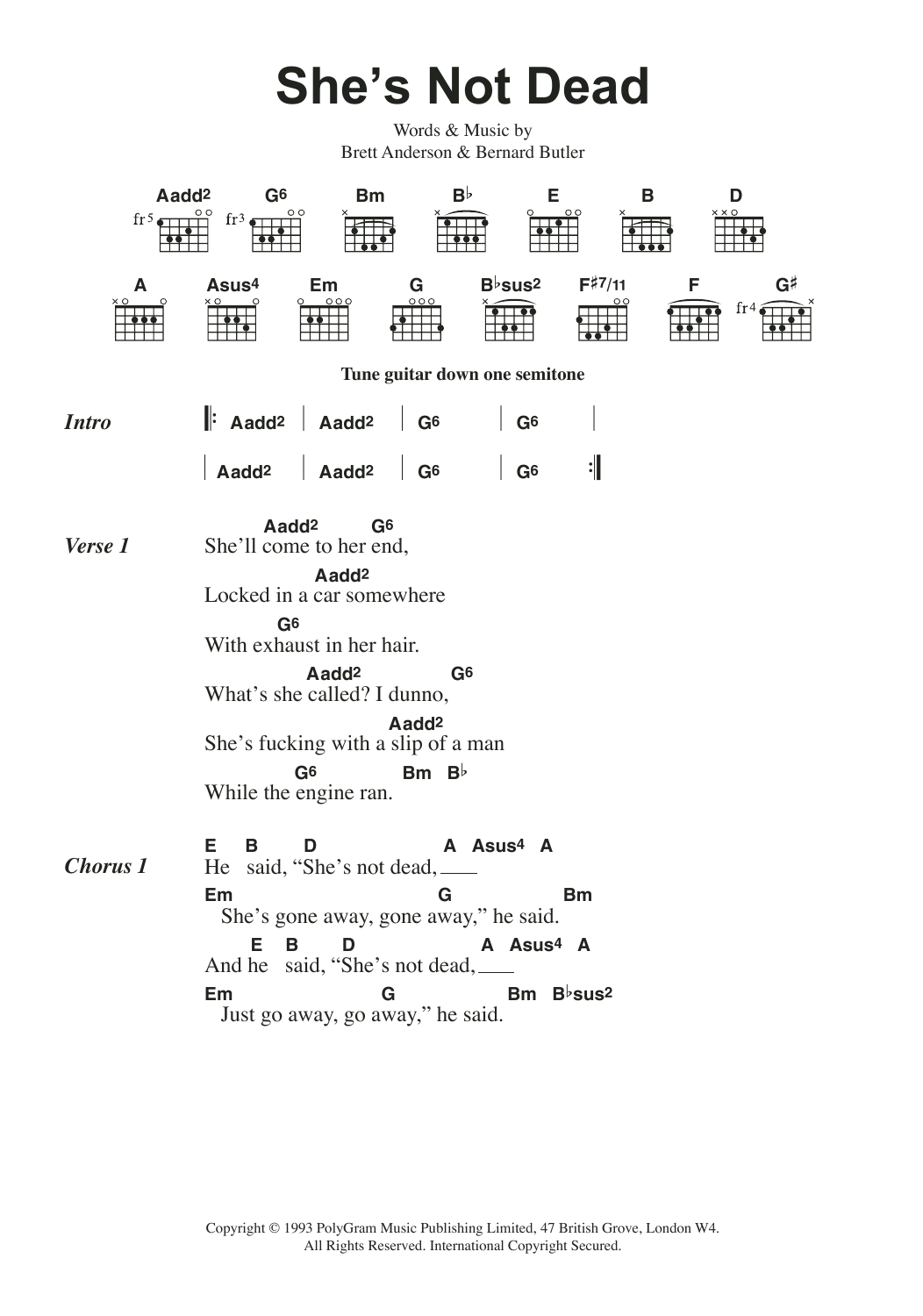 Suede She's Not Dead sheet music, chords, lyrics - Printable PDF for Lyrics & Chords
