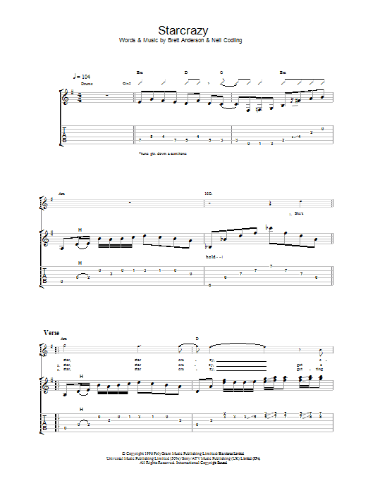 Suede Starcrazy sheet music, chords, lyrics - Printable PDF for Guitar Tab