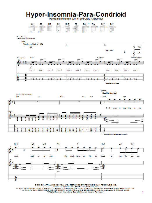 Sum 41 Hyper-Insomnia-Para-Condrioid sheet music, chords, lyrics - Printable PDF for Guitar Tab