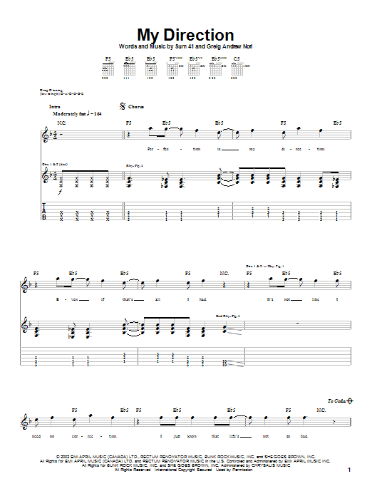 Sum 41 My Direction sheet music, chords, lyrics - Printable PDF for Guitar Tab