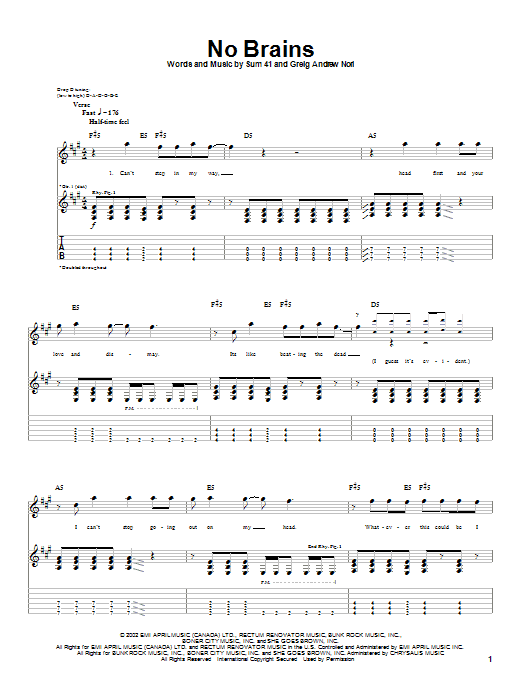 Sum 41 No Brains sheet music, chords, lyrics - Printable PDF for Guitar Tab