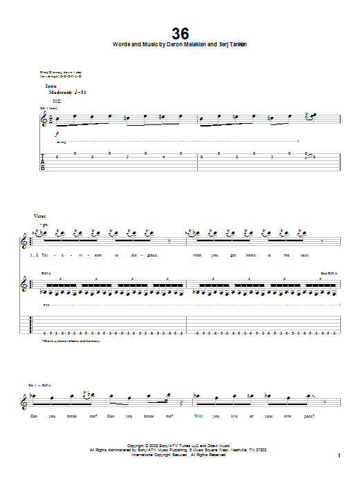 System Of A Down 36 sheet music, chords, lyrics - Printable PDF for Guitar Tab