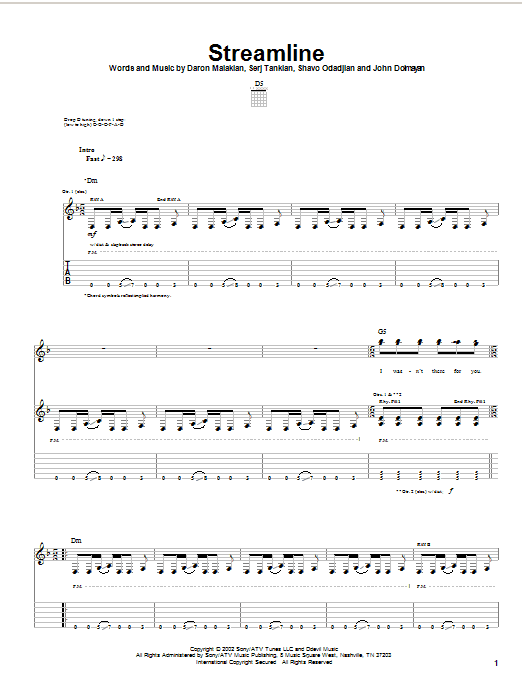 System Of A Down Streamline sheet music, chords, lyrics - Printable PDF for Guitar Tab