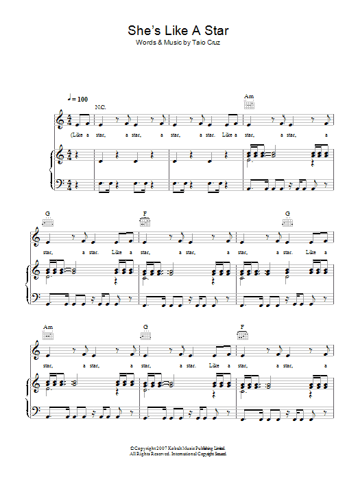 Taio Cruz She's Like A Star sheet music, chords, lyrics - Printable PDF for Piano, Vocal & Guitar (Right-Hand Melody)