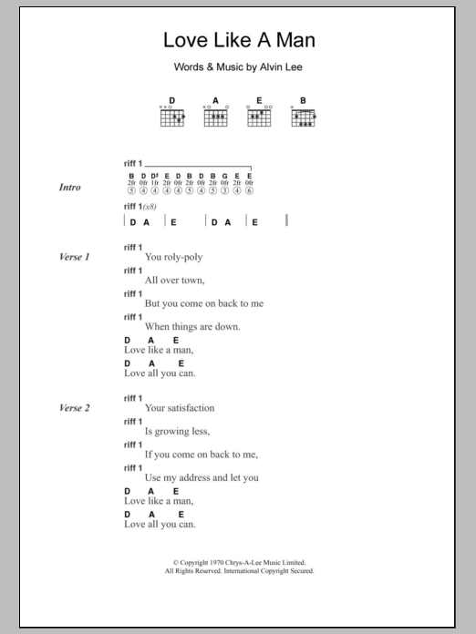 Ten Years After Love Like A Man sheet music, chords, lyrics - Printable PDF for Lyrics & Chords