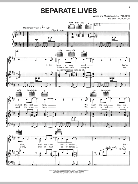 The Alan Parsons Project Separate Lives sheet music, chords, lyrics - Printable PDF for Piano, Vocal & Guitar (Right-Hand Melody)