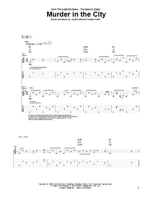 Download Avett Brothers Murder In The City sheet music and printable PDF notes for Guitar Tab. This score composition includes 6 page(s). It was wonderfuly put together for the style of Pop with catalog SKU number of 157269. Popular song was originally published on 2014-12-17T00:00:00 and was updated on 2022-03-26T00:00:00. The arrangement code for Avett Brothers sheet music is TAB and minimum required purchase quantaty of the digital score is 1. Learn more about Avett Brothers and click here ».