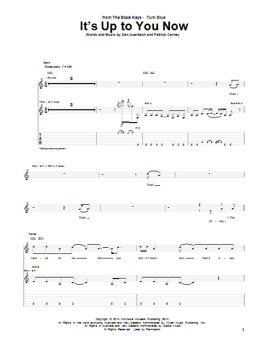 Download The Black Keys It's Up To You Now sheet music and printable PDF notes for Guitar Tab. This score composition includes 9 page(s). It was wonderfuly put together for the style of Pop with catalog SKU number of 155799. Popular song was originally published on 2014-09-11T00:00:00 and was updated on 2020-11-30T00:00:00. The arrangement code for The Black Keys sheet music is TAB and minimum required purchase quantaty of the digital score is 1. Learn more about The Black Keys and click here ».