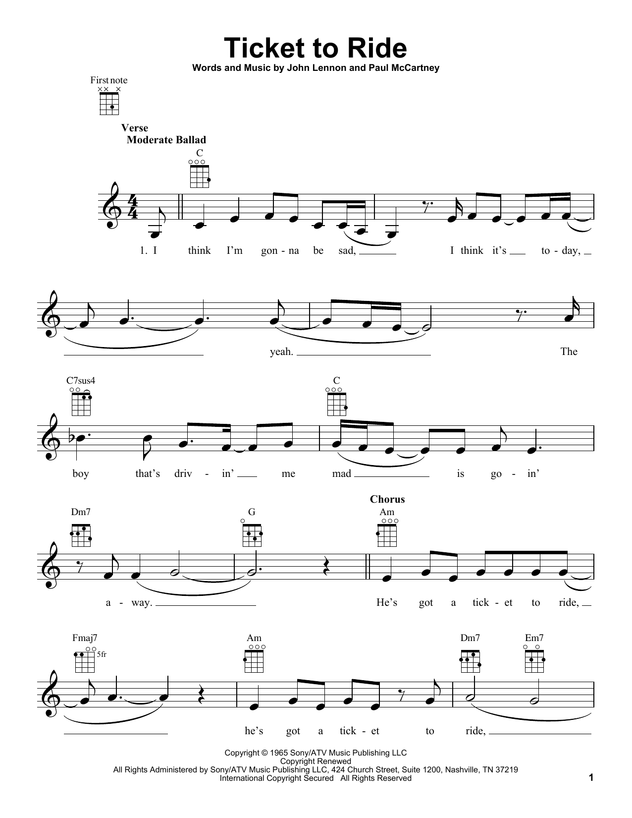 The Carpenters Ticket To Ride sheet music, chords, lyrics - Printable PDF for Ukulele