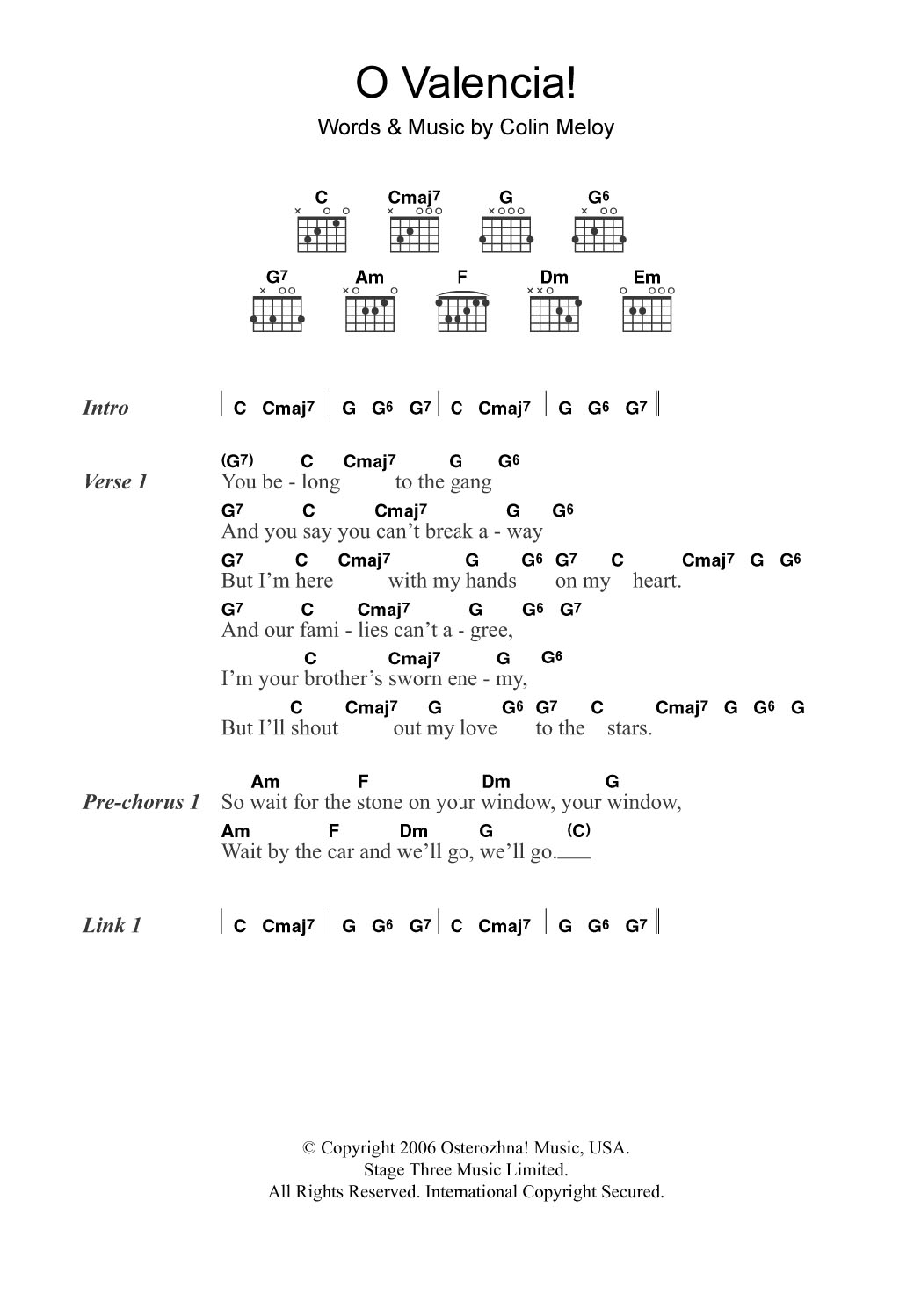 The Decemberists O Valencia! sheet music, chords, lyrics - Printable PDF for Lyrics & Chords