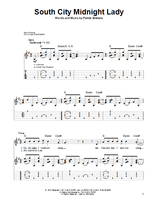 Download The Doobie Brothers South City Midnight Lady sheet music and printable PDF notes for Guitar Tab (Single Guitar). This score composition includes 8 page(s). It was wonderfuly put together for the style of Pop with catalog SKU number of 154463. Popular song was originally published on 2014-05-21T00:00:00 and was updated on 2023-01-13T00:00:00. The arrangement code for The Doobie Brothers sheet music is GPLA and minimum required purchase quantaty of the digital score is 1. Learn more about The Doobie Brothers and click here ».