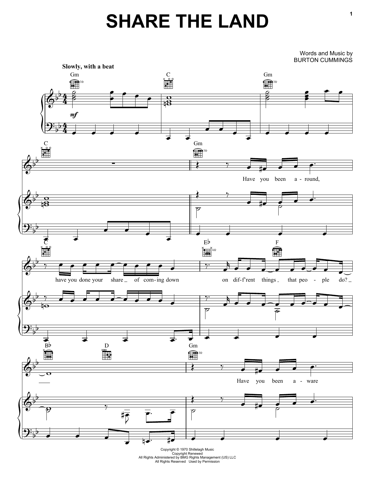 The Guess Who Share The Land sheet music, chords, lyrics - Printable PDF for Piano, Vocal & Guitar (Right-Hand Melody)