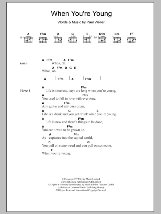 The Jam When You're Young sheet music, chords, lyrics - Printable PDF for Lyrics & Chords