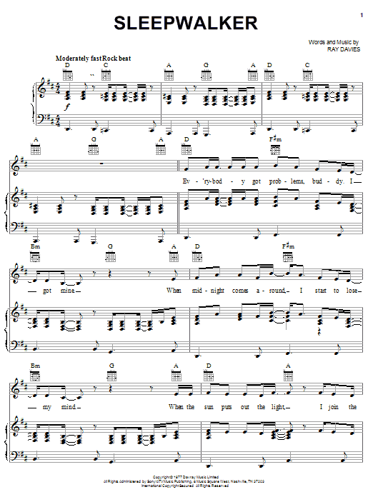 The Kinks Sleepwalker sheet music, chords, lyrics - Printable PDF for Piano, Vocal & Guitar (Right-Hand Melody)
