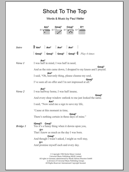 The Style Council Shout To The Top sheet music, chords, lyrics - Printable PDF for Lyrics & Chords