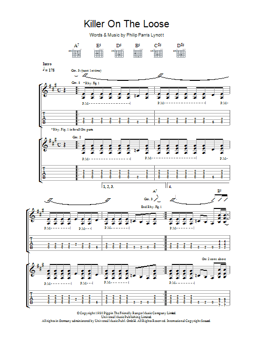 Thin Lizzy Killer On The Loose sheet music, chords, lyrics - Printable PDF for Guitar Tab
