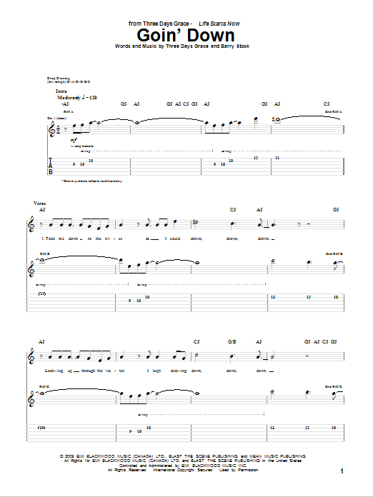Three Days Grace Goin' Down sheet music, chords, lyrics - Printable PDF for Guitar Tab