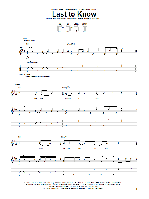 Three Days Grace Last To Know sheet music, chords, lyrics - Printable PDF for Guitar Tab
