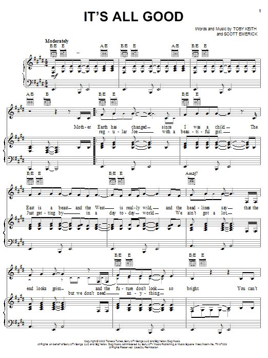 Toby Keith It's All Good sheet music, chords, lyrics - Printable PDF for Piano, Vocal & Guitar (Right-Hand Melody)