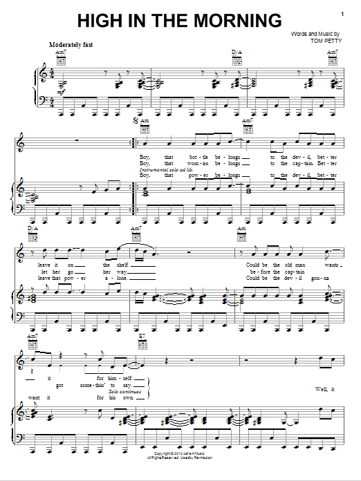 Tom Petty And The Heartbreakers High In The Morning sheet music, chords, lyrics - Printable PDF for Piano, Vocal & Guitar (Right-Hand Melody)