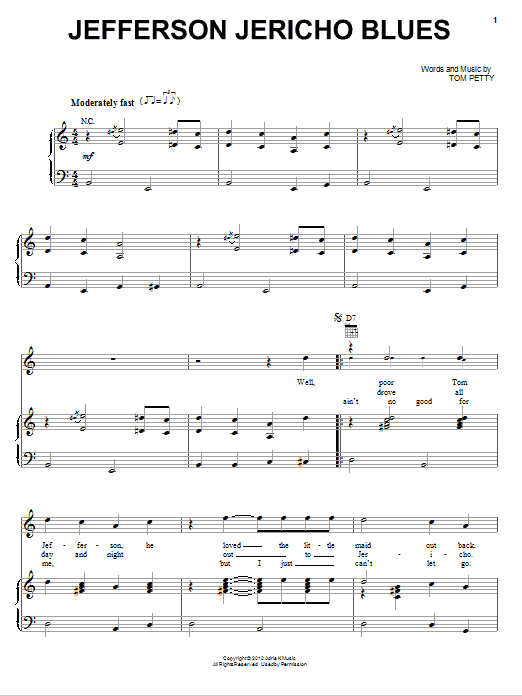 Tom Petty And The Heartbreakers Jefferson Jericho Blues sheet music, chords, lyrics - Printable PDF for Piano, Vocal & Guitar (Right-Hand Melody)