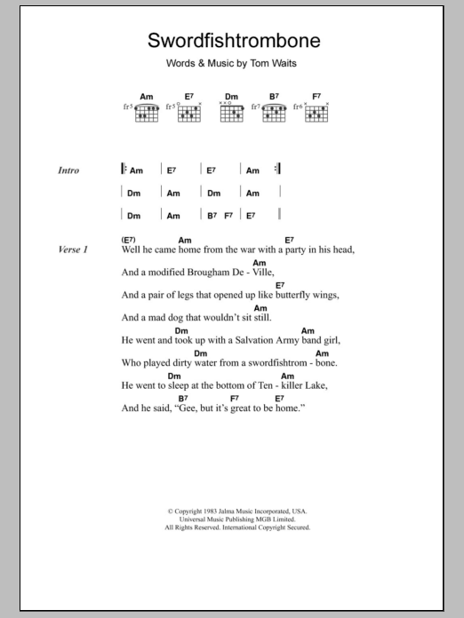 Tom Waits Swordfishtrombone sheet music, chords, lyrics - Printable PDF for Lyrics & Chords