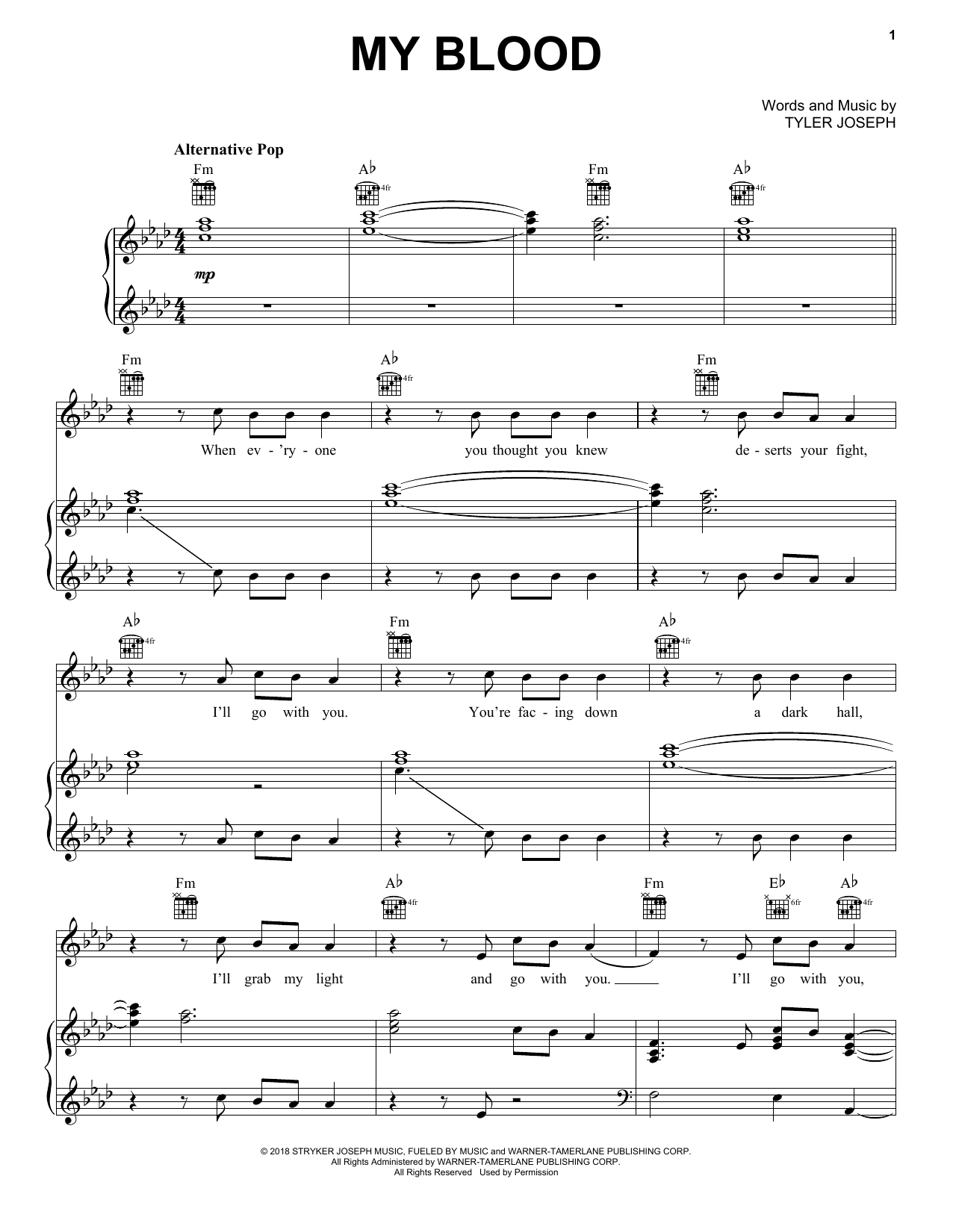 Twenty One Pilots My Blood sheet music, chords, lyrics - Printable PDF for Piano, Vocal & Guitar (Right-Hand Melody)